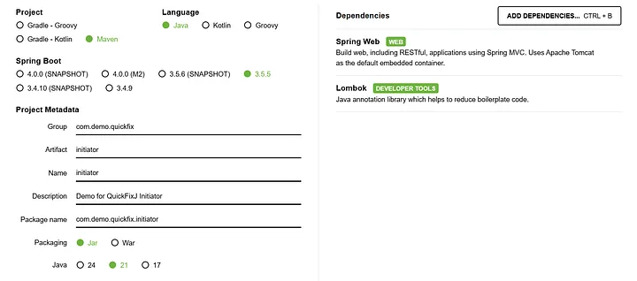 Une fois le projet généré, l'étape suivante consiste à ajouter les dépendances QuickFIX/J à votre fichier pom.xml. Ces bibliothèques fourniront à notre application Spring Boot le support du moteur FIX dont elle a besoin :